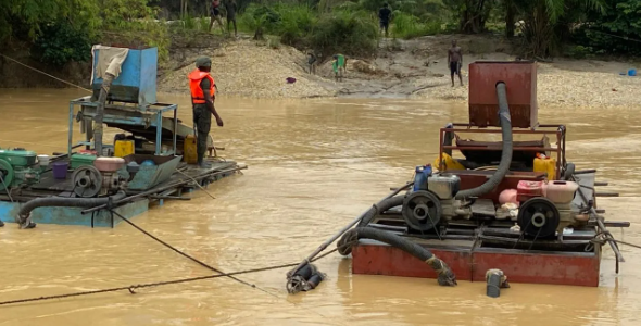 Miners use floating dredgers fitted with engines (changfa) to suck up sediments from riverbeds. Severe river pollution, destroys riverbanks and aquatic life.